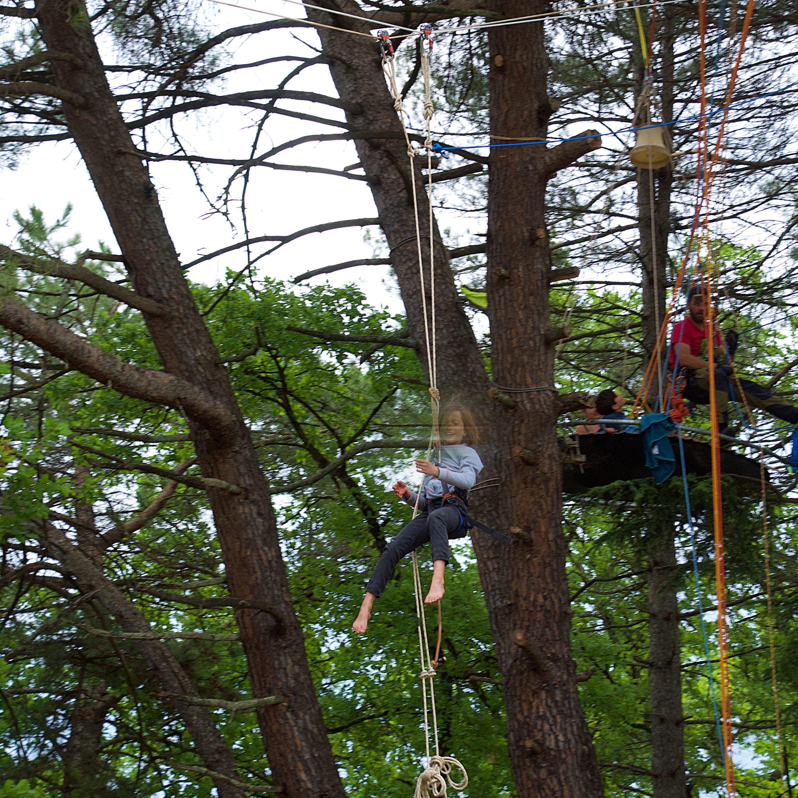 Tyrolienne retenue, ou dite « molle », saut pendulaire et pont de singe.