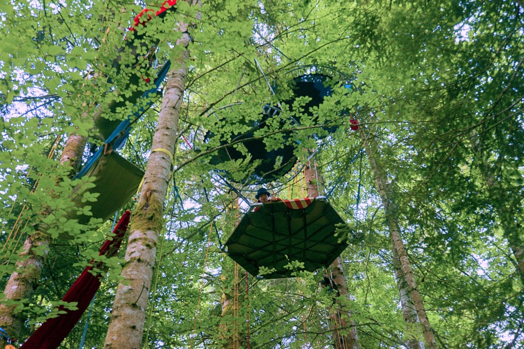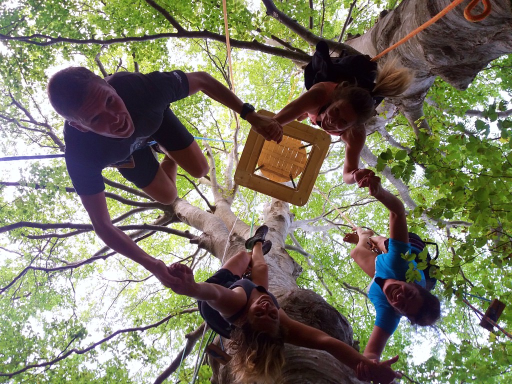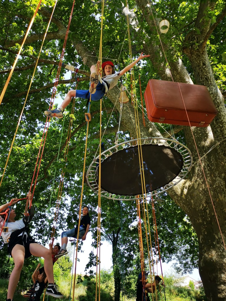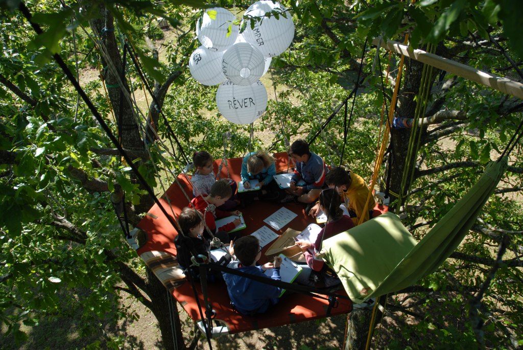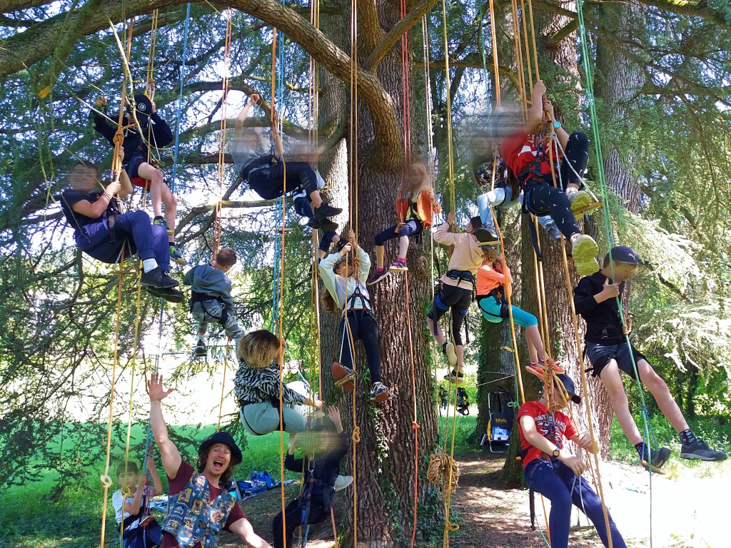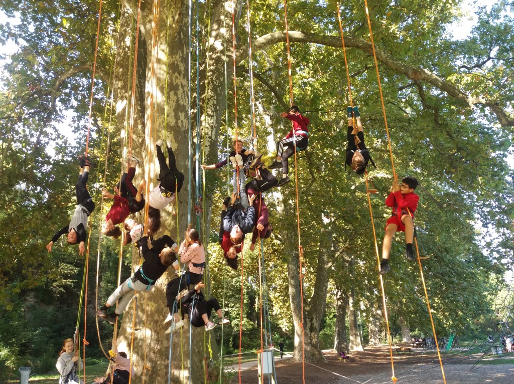 Robin des boisStructures alvéolairesClasse perchéeComment on grimpe??Sur un chêne cheveluOn grimpe!!Une autre façon de descendreLa tête en basEn pleine ascensionDans tous les sensVue du solA la cimeAvant l’apéroLe village de Peter Pan Vive la TyroAprès la siestePour HalloweenTyro retenueTout le monde perchés